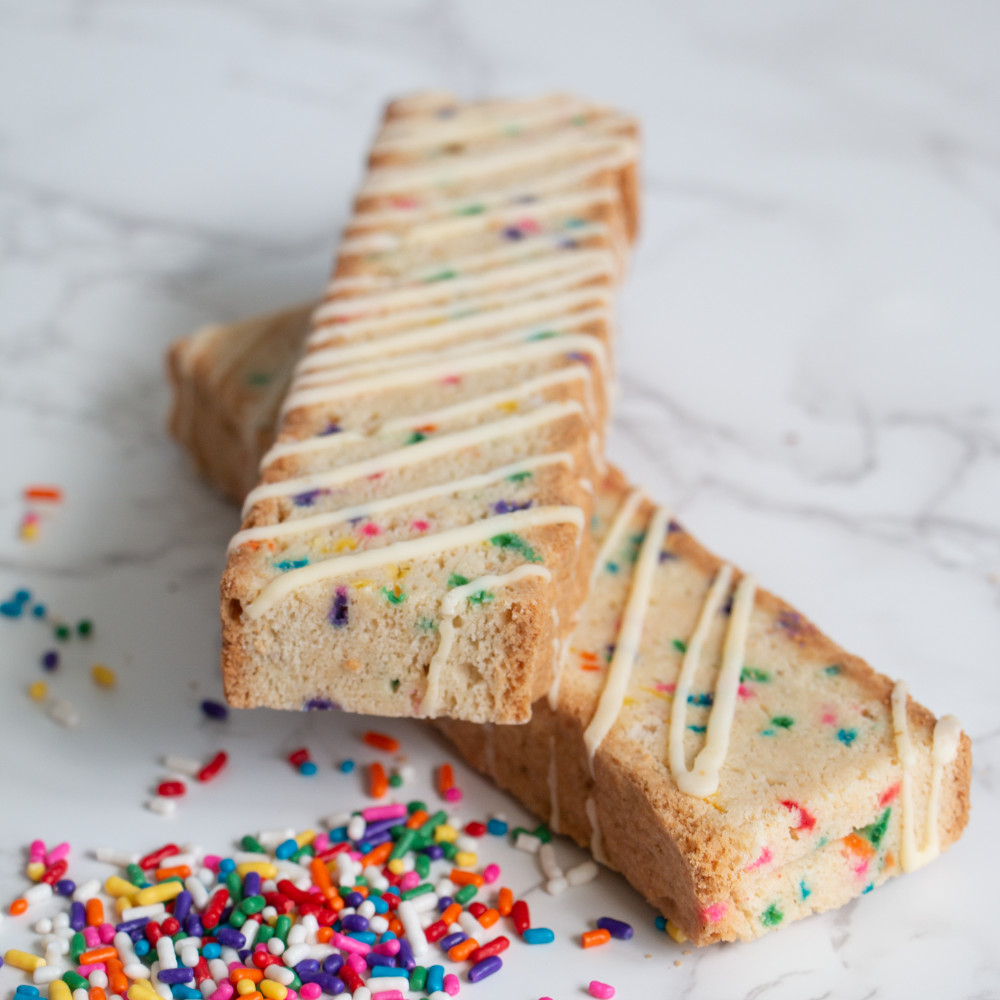 Nothing says happy birthday like sprinkles! These biscotti are made with colorful sprinkles and crisscrossed with the finest white Belgian chocolate.